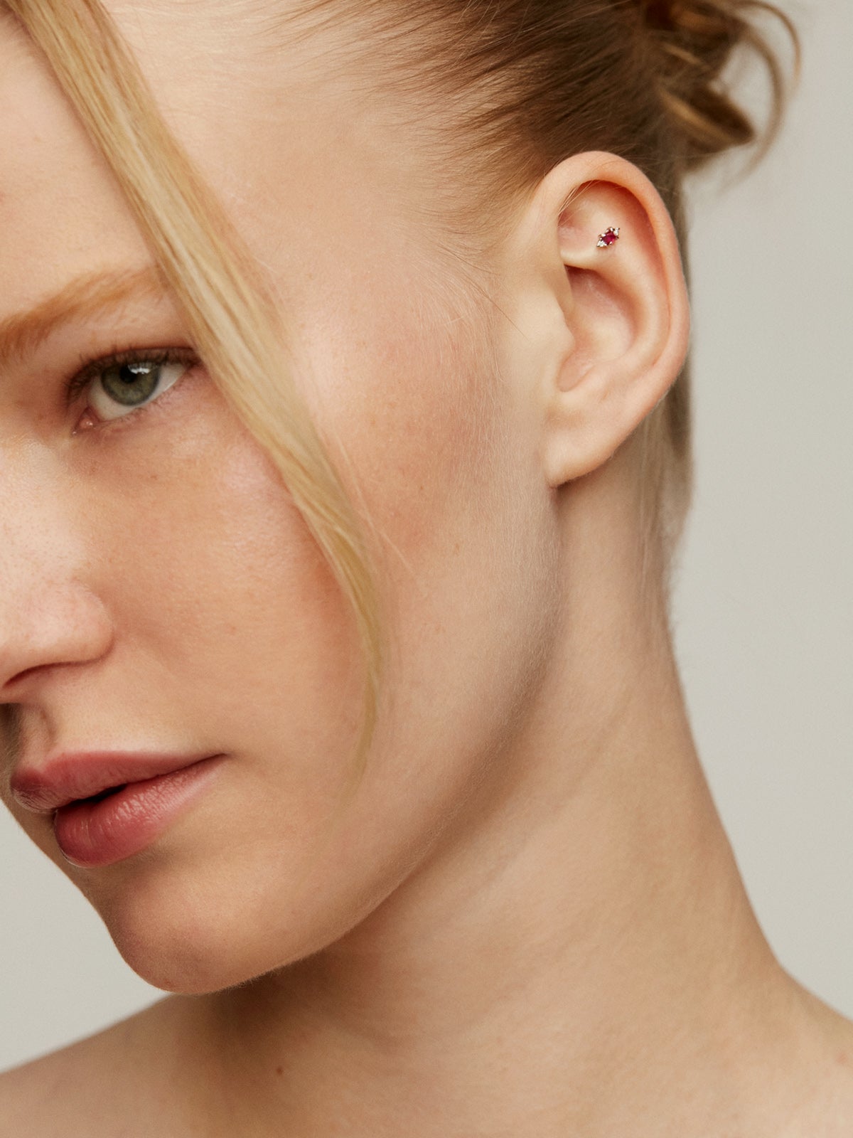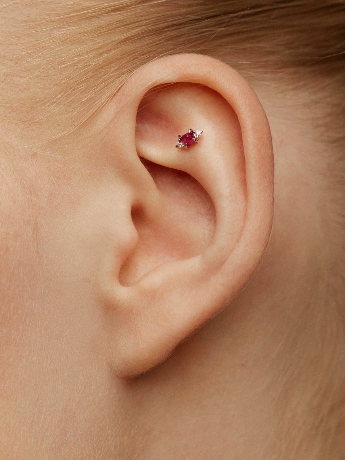 Este piercing de vanguardia de la colección Kambio potencia la intensidad del rubí al combinarlo con dos transparentes diamantes, generando un contraste único que dará un giro de 180º a tu earlook. Todas las gemas y perlas de esta colección son naturales. Cada una es totalmente única, por eso su tonalidad puede variar respecto a la imagen de referencia.