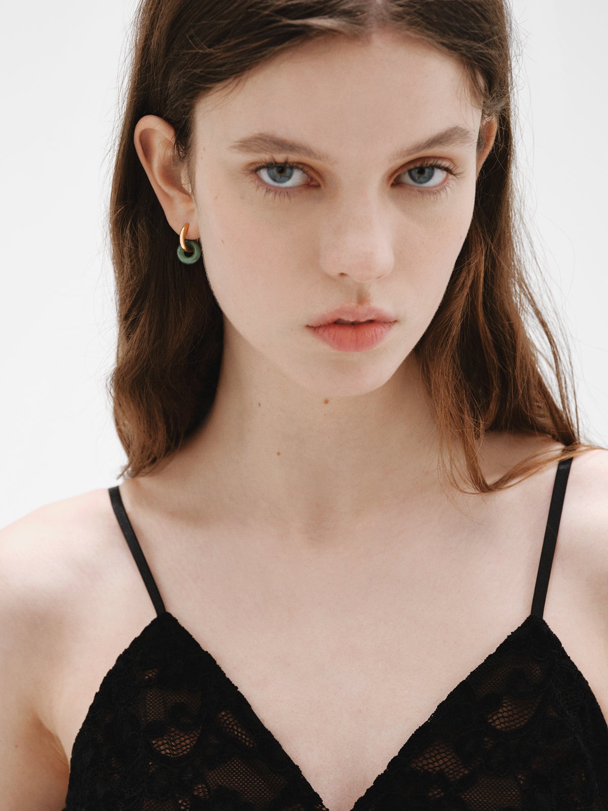 Pendientes de aro pequeños de plata 925 bañada en oro amarillo de 18K con aventurina verde