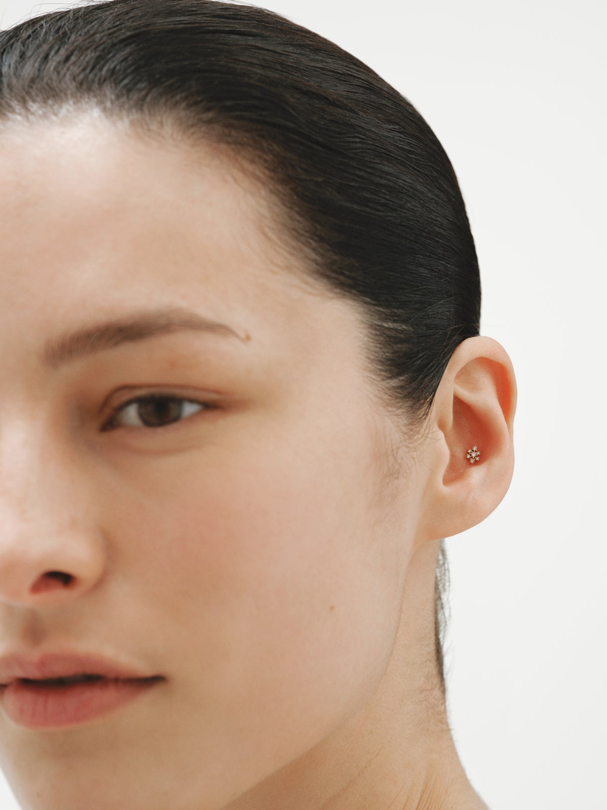 El clásico símbolo de la flor se reinventa en este piercing de oro blanco y diamantes. La joya perfecta para iluminar tu rostro y darle a tu look un toque muy especial. Esta joya contiene piedras preciosas naturales, por eso, su tonalidad puede variar respecto a la imagen de referencia.