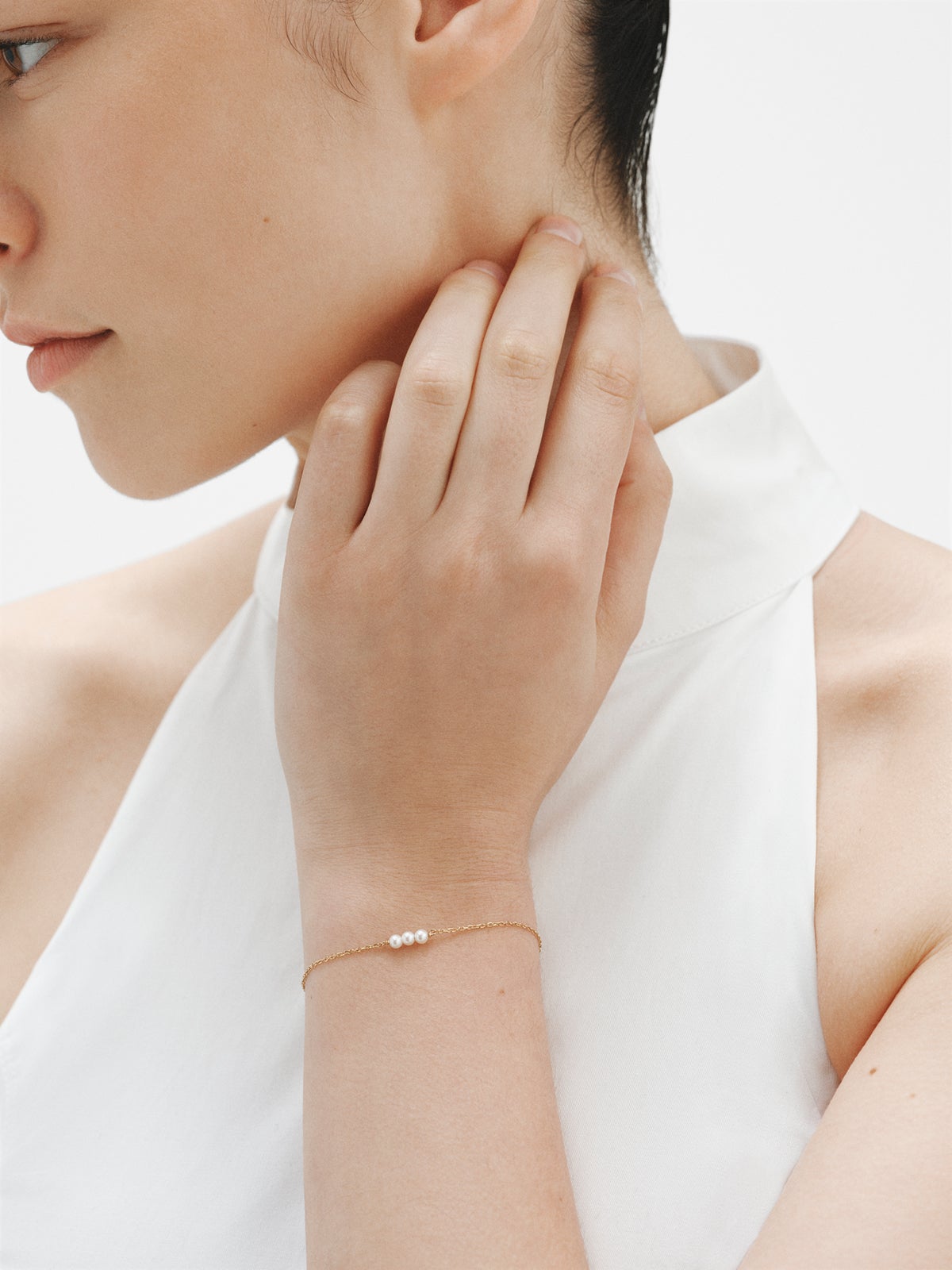 Sencilla y atemporal. Esta pulsera combina una cadena sencilla de plata bañada en oro amarillo con tres perlas que destacan como protagonistas. La joya perfecta para acompañarte tanto en el día a día como en ocasiones más especiales. Esta joya contiene perlas naturales, por eso, su tonalidad puede variar respecto a la imagen de referencia.